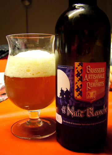 Inauguriamo con questa Nuit Blanche una lunga serie di degustazione di birre francesi. La Brasserie Artisanale des Remparts si trova poco fuori Dinan, splendida località nell’entroterra della Bretagna che ha conservato praticamente intatto il suo nucleo storico medievale. Colore ambrato/arancio, torbida, cappello di schiuma bianca, fine, poco persistente che non lascia pizzo nel bicchiere. Aroma di agrumi (arancio), spezie (coriandolo) ed altre note fruttate. Corpo leggero, alta carbonatazione. Watery in bocca ed abbastanza sfuggente, leggero gusto di cereali, arancio e spezie. Finisce secca con un retrogusto leggermente luppolato ed amaro. Classificata come biere de garde da Ratebeer, è in realtà – come il nome suggerisce – una blanche molto acquosa e sfuggente, gusto gradevole ma molto poco memorabile. Bottiglia da 75 cl., ABV 5%, 4.70 €._________________